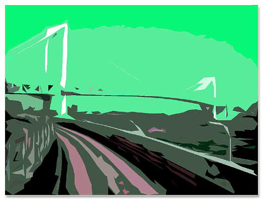 1993年に完成した、トラス補鋼の吊り橋 レインボーブリッジ。 そのデッキは、海面から50mもの高さがあり、大型の帆船でも、通ることができます。 ゆりかもめは、この橋を渡るために、大きな円弧を描きながら、徐々に高さを上げていきます。 東京・お台場 2002・8 #2 CG