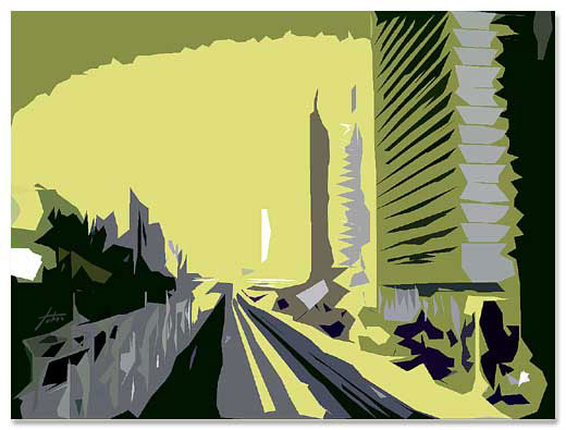 広大な新しい町は、線路が真っ直ぐ。 この臨海副都心をさして、お台場と呼びますが、この付近の地名は、まさに「台場」。 画面外の左方面には、「大砲の台」の跡があります。 ペリーが浦賀に現れたのを機に、江戸幕府が、1853年に造ったものです。 東京・お台場 2002・8 #3 CG