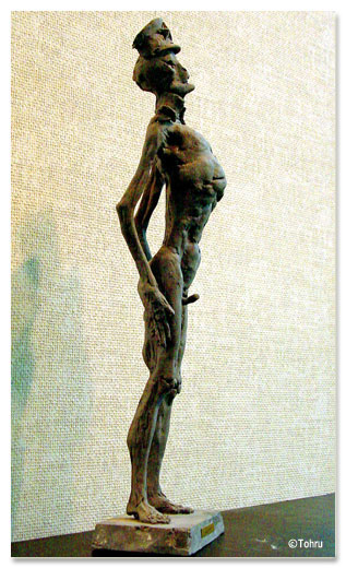 作家は、東京美術学校(現東京芸術大学)在学中に、学徒動員に遭い、人の生死のきわを見ました。 この作品は、戦後、歴史教科書から削除さていた、乃木大将、東郷元帥が、再び掲載されたことを契機に、創作されました。 熊谷 博 (会の主宰者) いざ出陣 彫刻 45cm 1998年頃