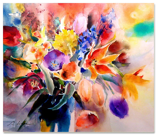 明るく曇りのない水彩画です。 作家の人柄を、彷彿とさせます。 斉藤 朱美 華 水彩 F10 45×53cm 2003年