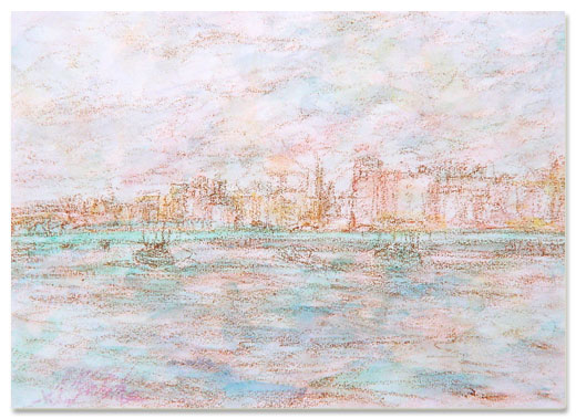 (夏) 岸辺の草、もえにもえ、光の波、あふれ、寄せる。 風はらみ、青々と草木の葉、空の深さを映す。 日高く、空 さらに青く、雲は白さを増す。 強き光は、山に。 深い川〜言問橋 水彩 F4 24×33cm 1985年